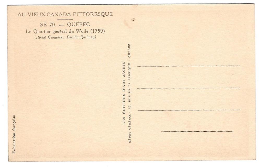 Canada Vintage Postcard Title/Description:  Canada Quebec Le Quartier General de Wolfe ERA/Style:    Divided Back Photographer / Artist:     Jackie Publisher:           Les Editions D'Ar ... Read More