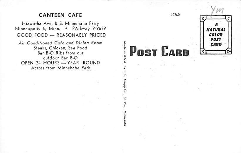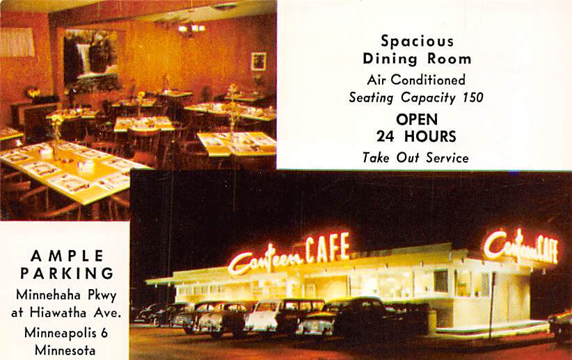 Canteen Café Minneapolis, Minnesota MN Postcard - Unused Grade: 1 Size: R - Regular size: Approx 3 1/2 X 5 1/2 inch (9 cm X 14 cm) Grading Scale: Grade 1 = Perfect corners Grade 2 = Very Minimal corner wear, n ... Read More
