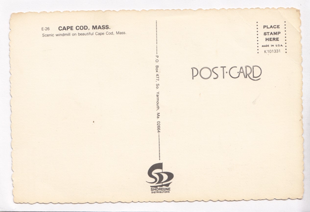 22548 Cape Cod, Mass, Scenic windmill, unused Postcard Condition: good to very good, one corner is worn and creased.