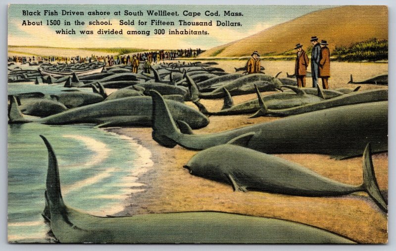 Cape Cod Massachusetts~Black Fish Driven Ashore On Beach~Vintage Linen Postcard