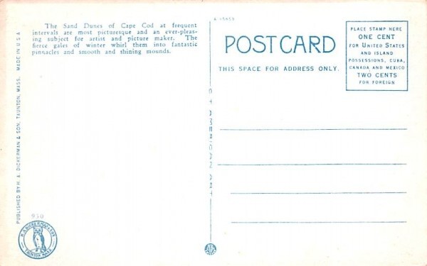 Cape Cod Sand Dunes in Provincetown, Massachusetts Postcard - Unused Grade: 2 Size: R - Regular size: Approx 3 1/2 X 5 1/2 inch (9 cm X 14 cm) Grading Scale: Grade 1 = Perfect corners Grade 2 = Very Minimal co ... Read More