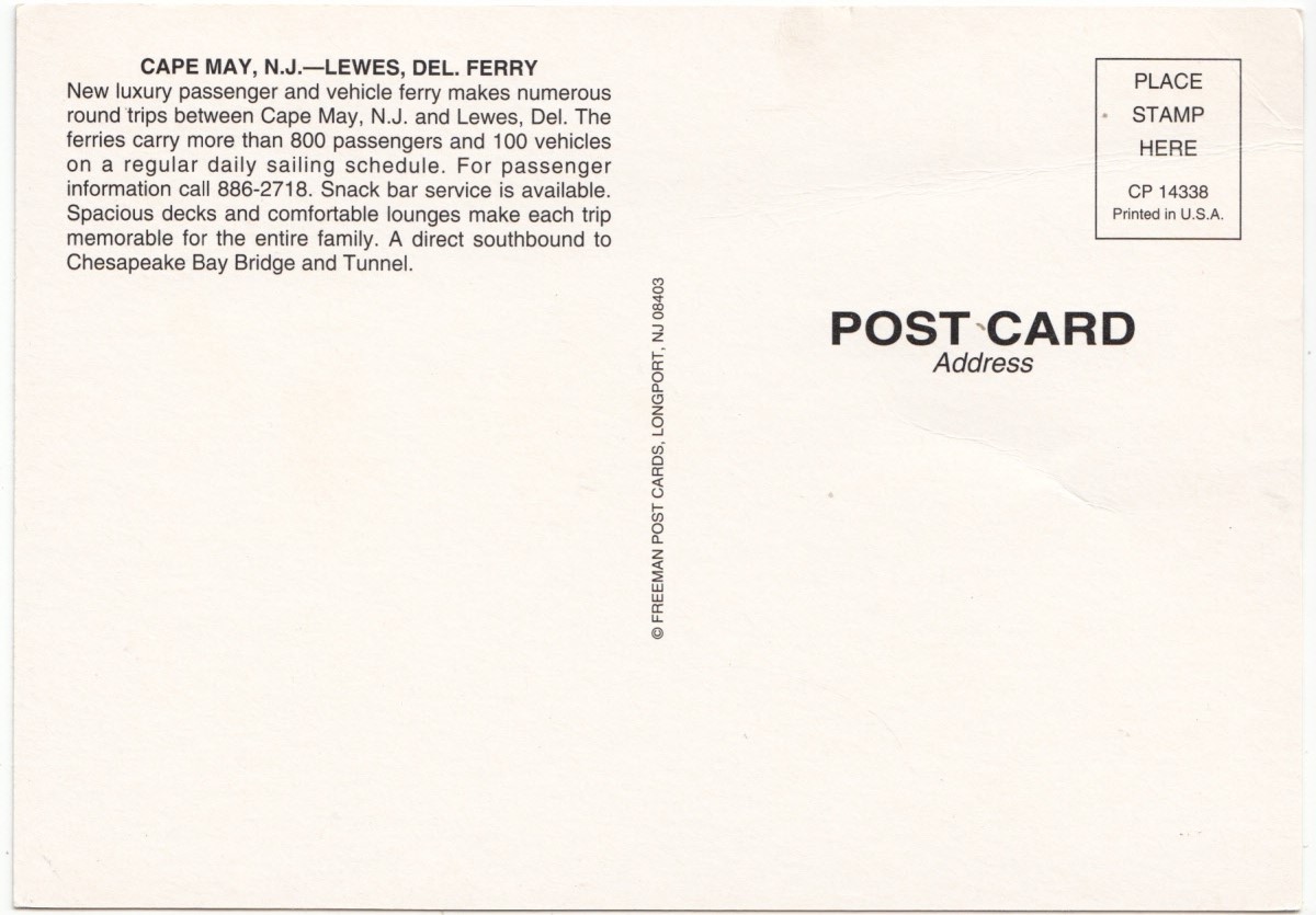18767 Cape May, NJ-Lewes, Del. Ferry, unused Postcard approximately 4 by 6 inches Condition: very good, corners slightly worn & creased.