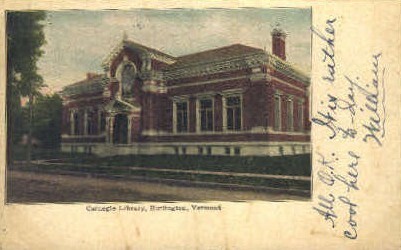 Carnegie Library - Burlington, Vermont Postcard - 1905 Grade: 4 Size: R - Regular size: Approx 3 1/2 X 5 1/2 inch (9 cm X 14 cm) Grading Scale: Grade 1 = Perfect corners Grade 2 = Very Minimal corner wear, no ... Read More
