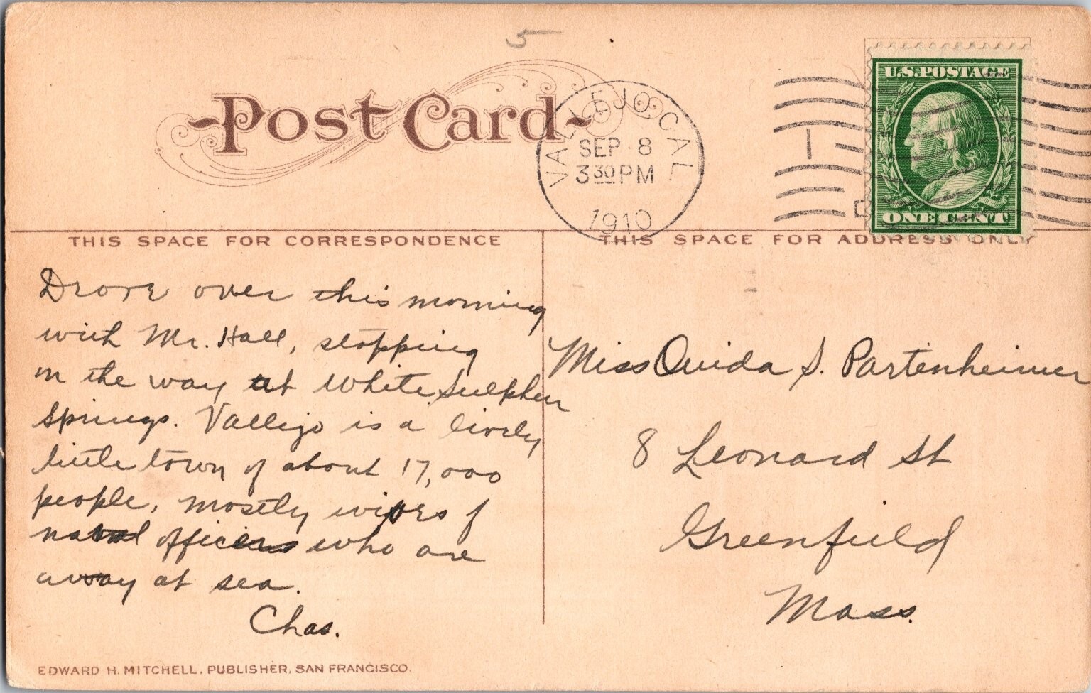 Discover a piece of early 20th-century California with this charming vintage postcard featuring the Carnegie Public Library in Vallejo, California. Published by Edward H. Mitchell of San Francisco, this card captures the classic architectural beauty of the library building, showcasing its distinctive design and the bustling atmosphere of Vallejo in 1910. The detailed chromolithograph printing technique brings the structure to life, making it a wonderful addition for collectors of California history, architectural postcards, or Carnegie Library memorabilia.This historical artifact offers a glimpse into the past, complete with a handwritten message detailing a stop at White Sulphur Springs and describing Vallejo as a lively town of 17,000, largely home to naval officers' wives. The postcard bears a clear 1910 postmark from Vallejo, California, and is addressed to Greenfield, Massachusetts, making it a fascinating piece of postal history. Ideal for enthusiasts of vintage California postcards, local history, or those seeking unique collectible ephemera.