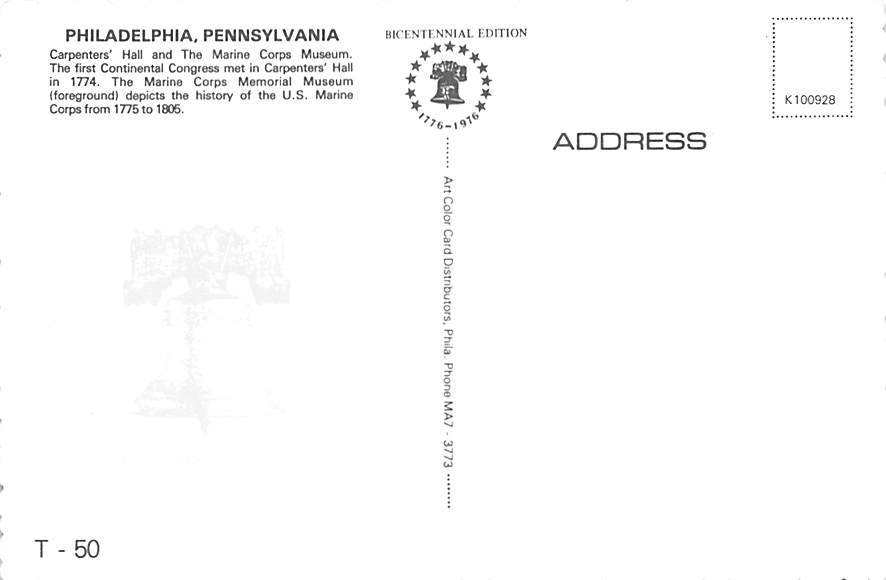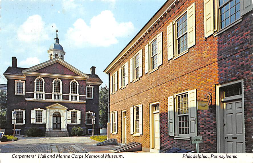 Carpeters Hall & Marine Corps Memorial Museum - Grade: 2 - stain on front Category: Continental Size Postcard, Approx 4 in x 6 in (10 cm x 15.25 cm) Product Size: Continental size: 4X6 inches (10.5 cm x 15 cm) ... Read More