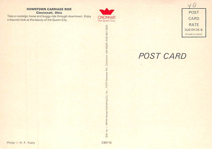 Carriage Ride, Ohio Postcard Grade: 1 Size: Continental Size - approximatly 4 Inch x 6 Inch (15 cm x 10.5) Grading Scale: Grade 1 = Perfect corners Grade 2 = Very Minimal corner wear, no creases Grade 3 = Some ... Read More