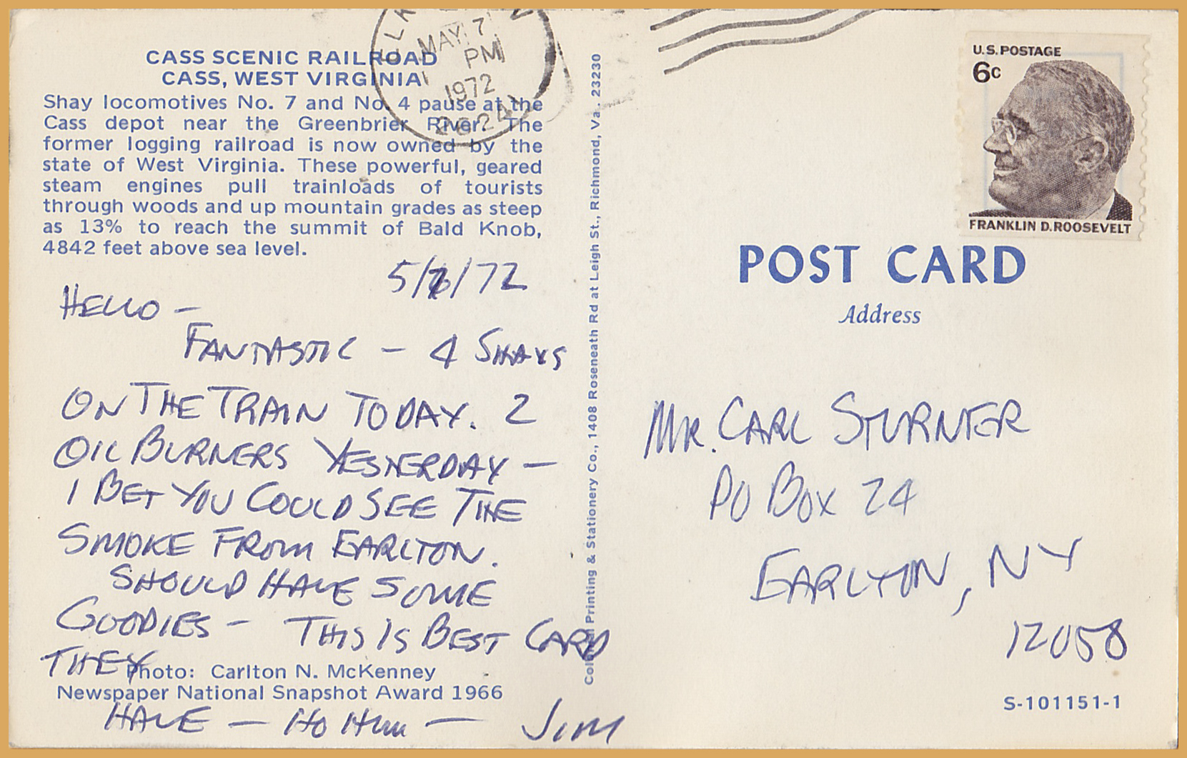 See awesome photos for condition - Postmarked Elkins, West Virginia, June 7, 1972 - Photo by Carlton N. McKenney Newspaper National Snapshot award 1966 Colonial Paper & Stationary Co.,