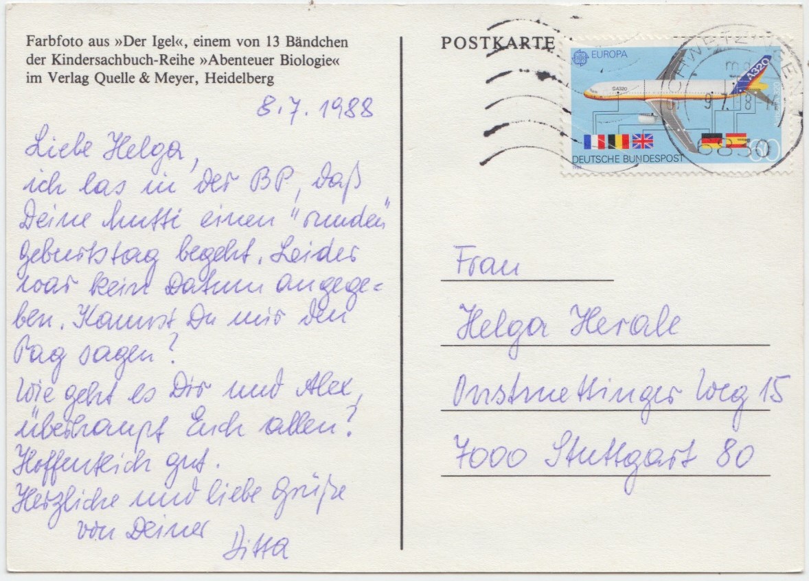 21135Cat & Hedgehog eating together, 1988 used Postcard