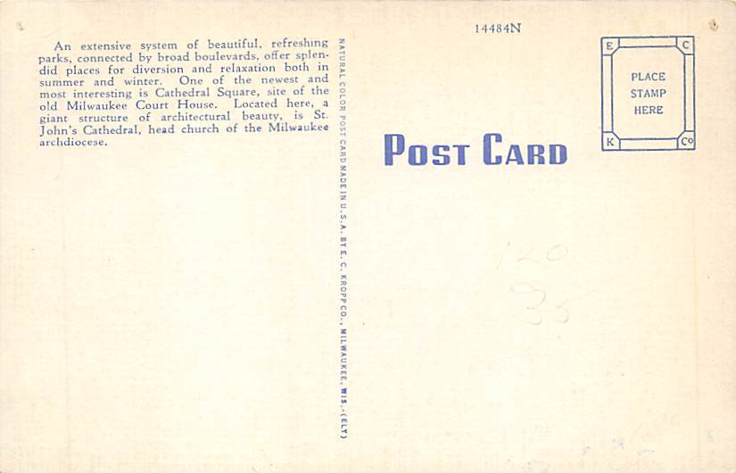 Cathedral Square Milwaukee WI Grade: Size: Regular Size Postcard - approximately 3 1/2 inch x 5 1/2 inch (9 CM x 14 CM) Grading Scale: Grade 1 = Perfect corners Grade 2 = Very Minimal corner wear, no creases Gr ... Read More