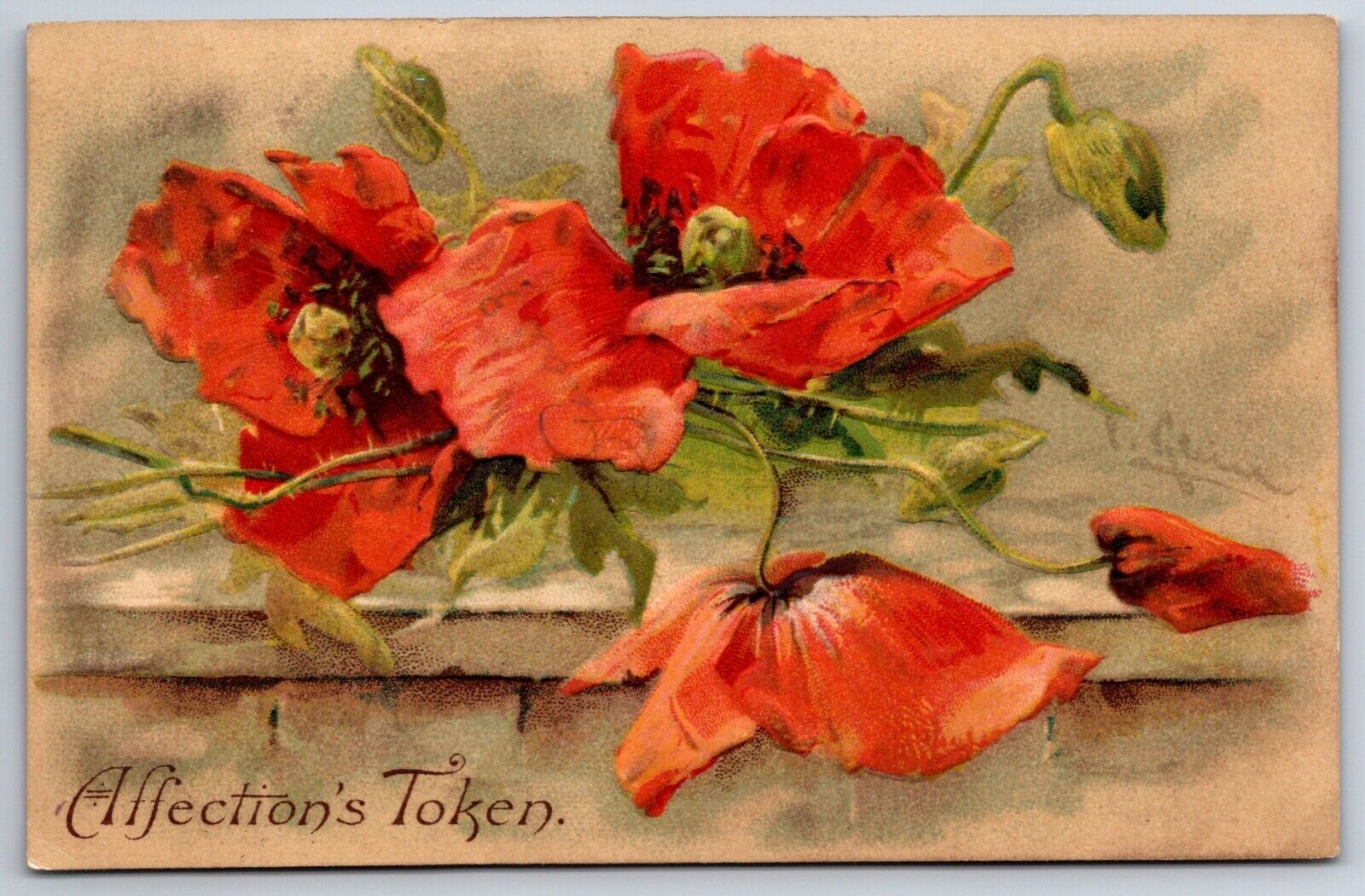 Catherine Klein~Affection's Token~Orange Poppies On Stone Ledge~Emboss~1909