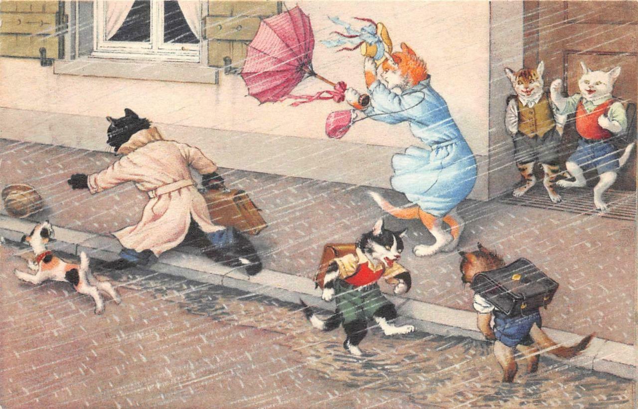 CATS UMBRELLA RAIN STORM COMIC DRESSED ANIMALS MAINZER NO. 4728 POSTCARD (1940s)
