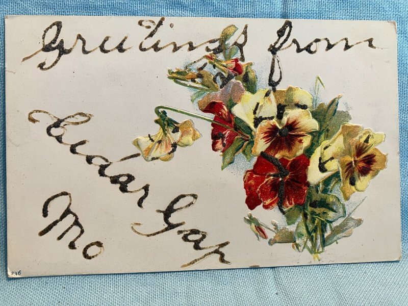 Cedar Gap Missouri Greetings From, Glitter Embossed Pansies Postcard