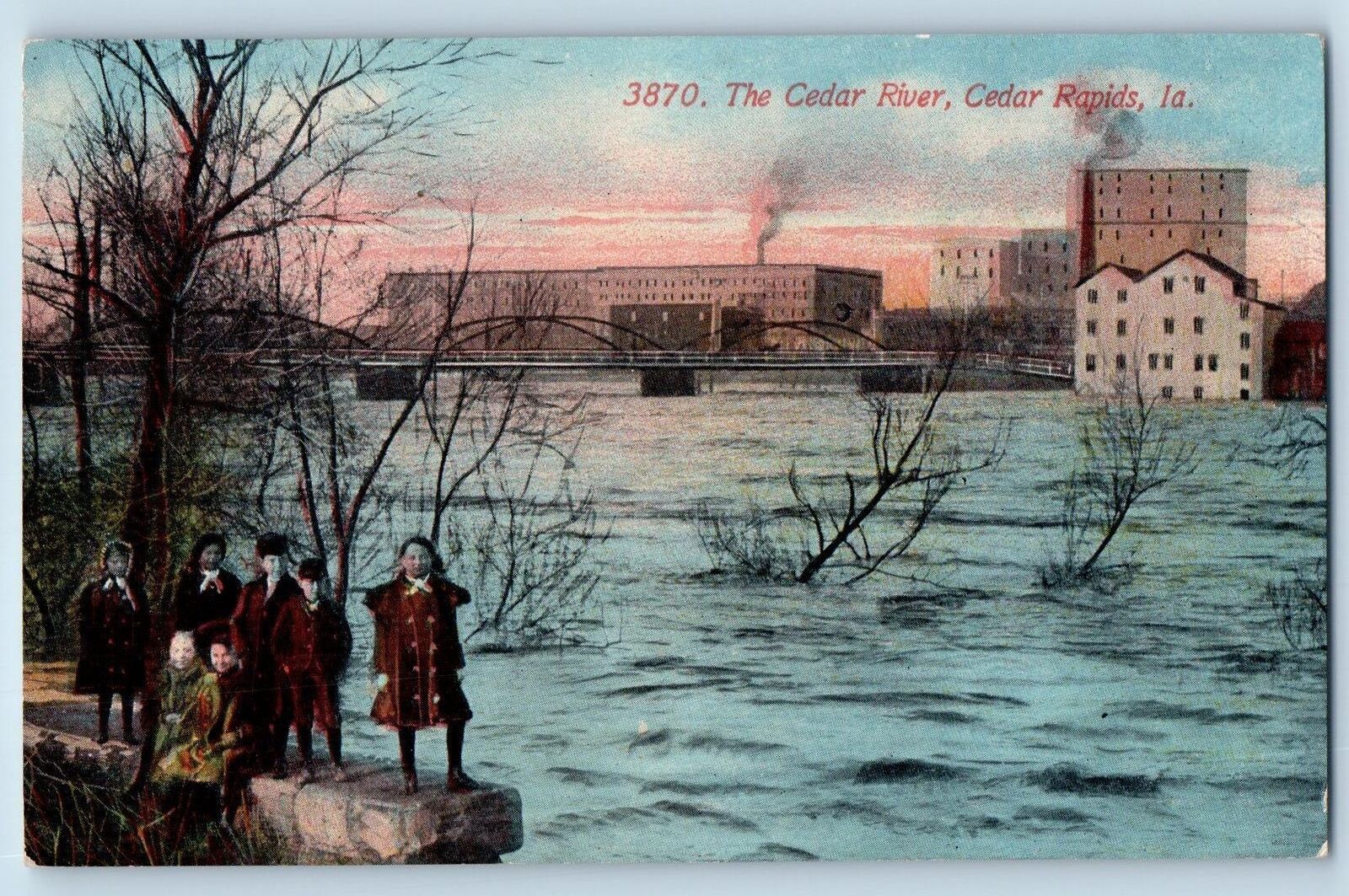Cedar Rapids Iowa IA Postcard The Cedar River Children & Buildings c1910s Trees