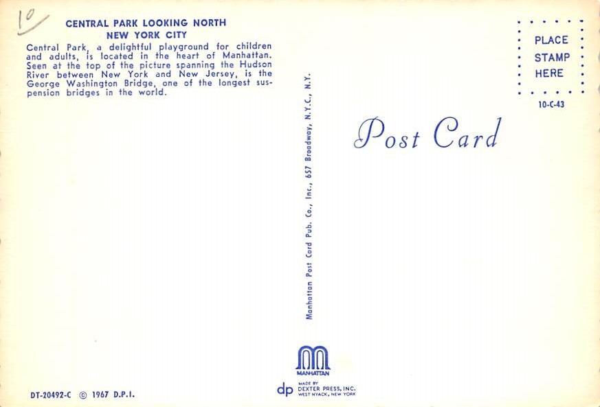 Central Park, New York Postcard Grade: 1 Size: Continental Size - approximatly 4 Inch x 6 Inch (15 cm x 10.5) Grading Scale: Grade 1 = Perfect corners Grade 2 = Very Minimal corner wear, no creases Grade 3 = S ... Read More