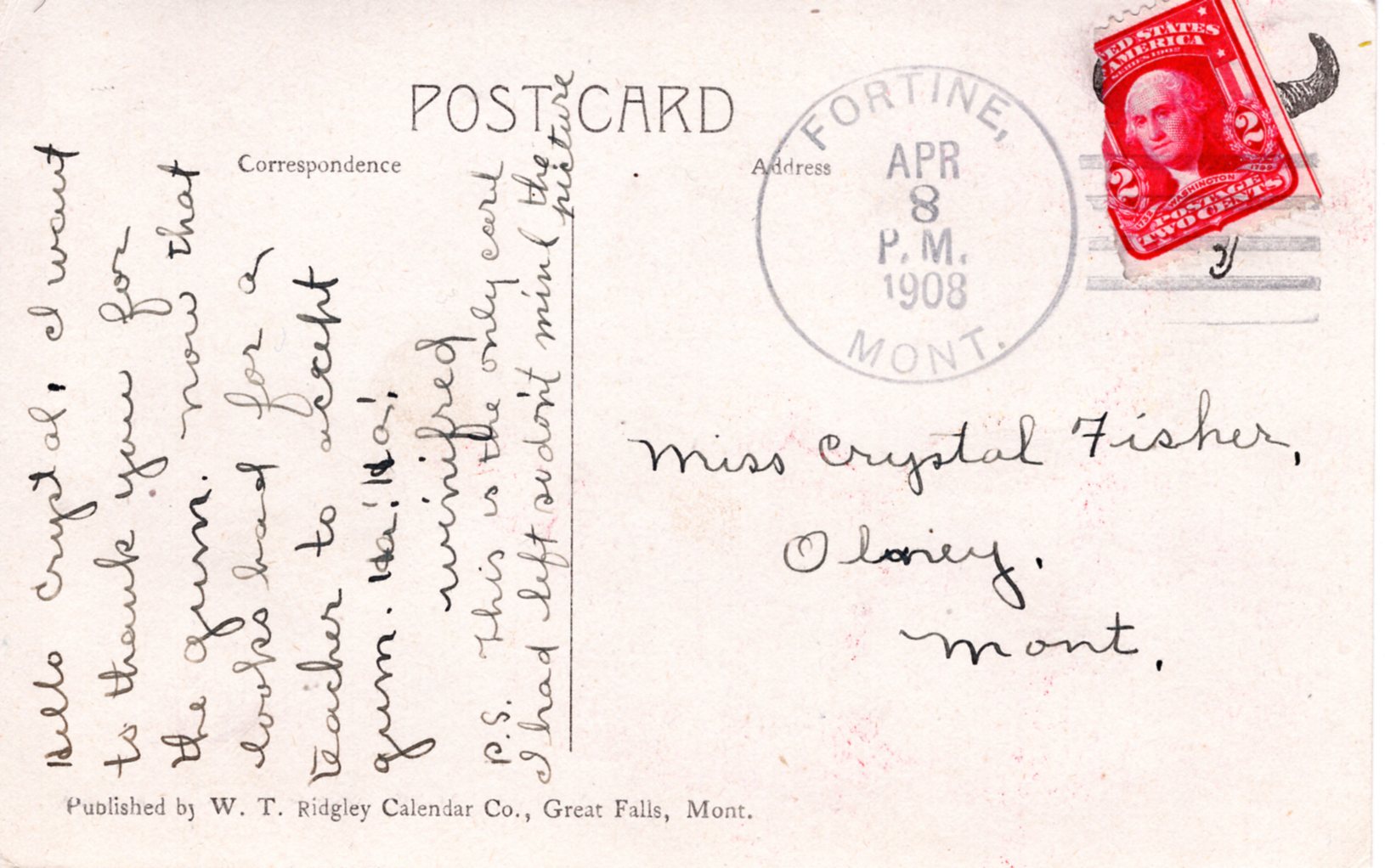 From the original Russell series produced in Great Falls Montana under Russell's supervision. Great price!Excellent condition, no faults, strong card. Postmarked April 8, 1908, Fortine, Montana.