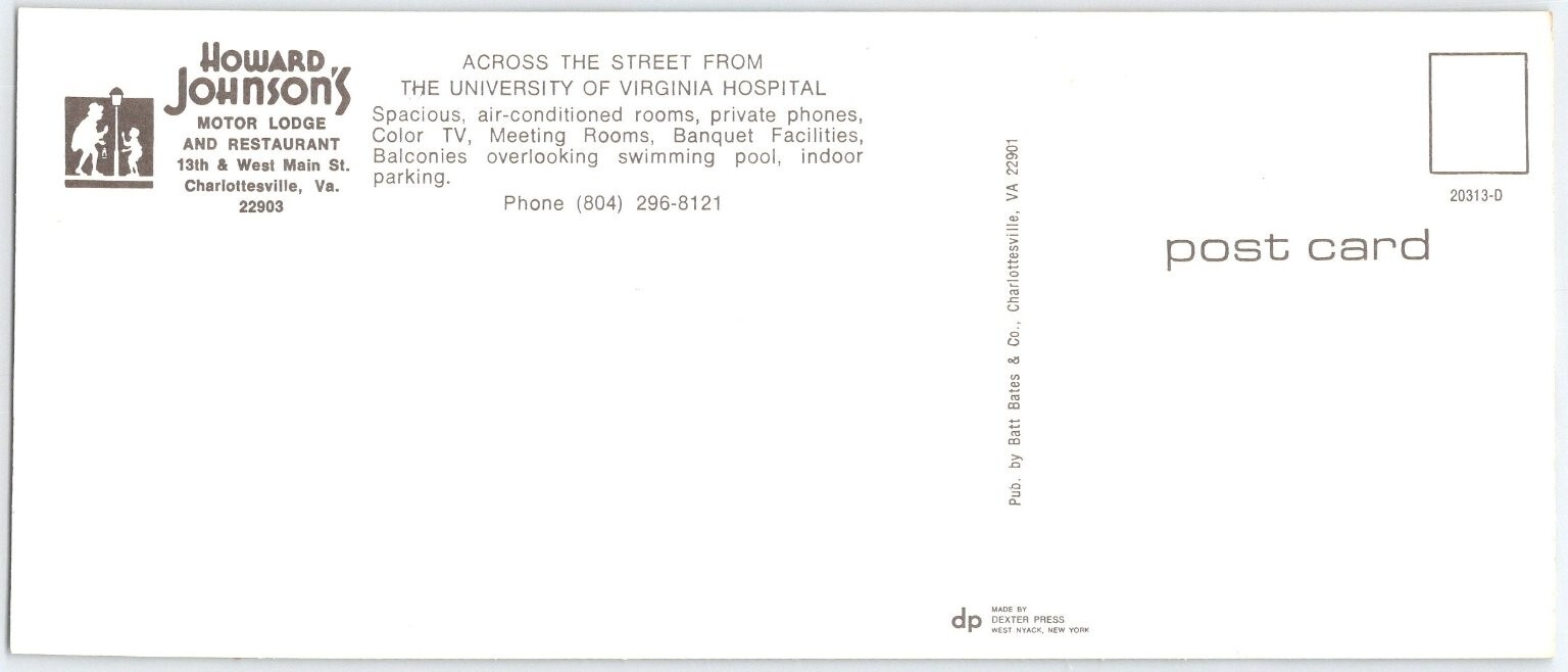 This vibrant vintage chrome postcard captures a dual perspective of Charlottesville, Virginia, showcasing two iconic landmarks. The left panel features the classic Howard Johnson's Motor Lodge and Restaurant, a prominent hospitality establishment of its era, identifiable by its distinctive architecture and signage, complete with an American flag flying proudly. This view provides a glimpse into mid-20th century American travel and roadside culture, highlighting the amenities offered such as air-conditioned rooms, color TV, and indoor parking, and noting its strategic location near the University of Virginia Hospital.The right panel beautifully depicts The University of Virginia Rotunda, a masterpiece of classical architecture designed by Thomas Jefferson, nestled amidst lush trees, suggesting the beauty of the campus. This postcard, produced by Dexter Press, West Nyack, New York, for Batt Bates & Co. of Charlottesville, is a collectible piece of Virginia's history, combining architectural significance with nostalgic Americana. It offers a wonderful visual narrative of a bygone era in Charlottesville, a gateway to Colonial Virginia.