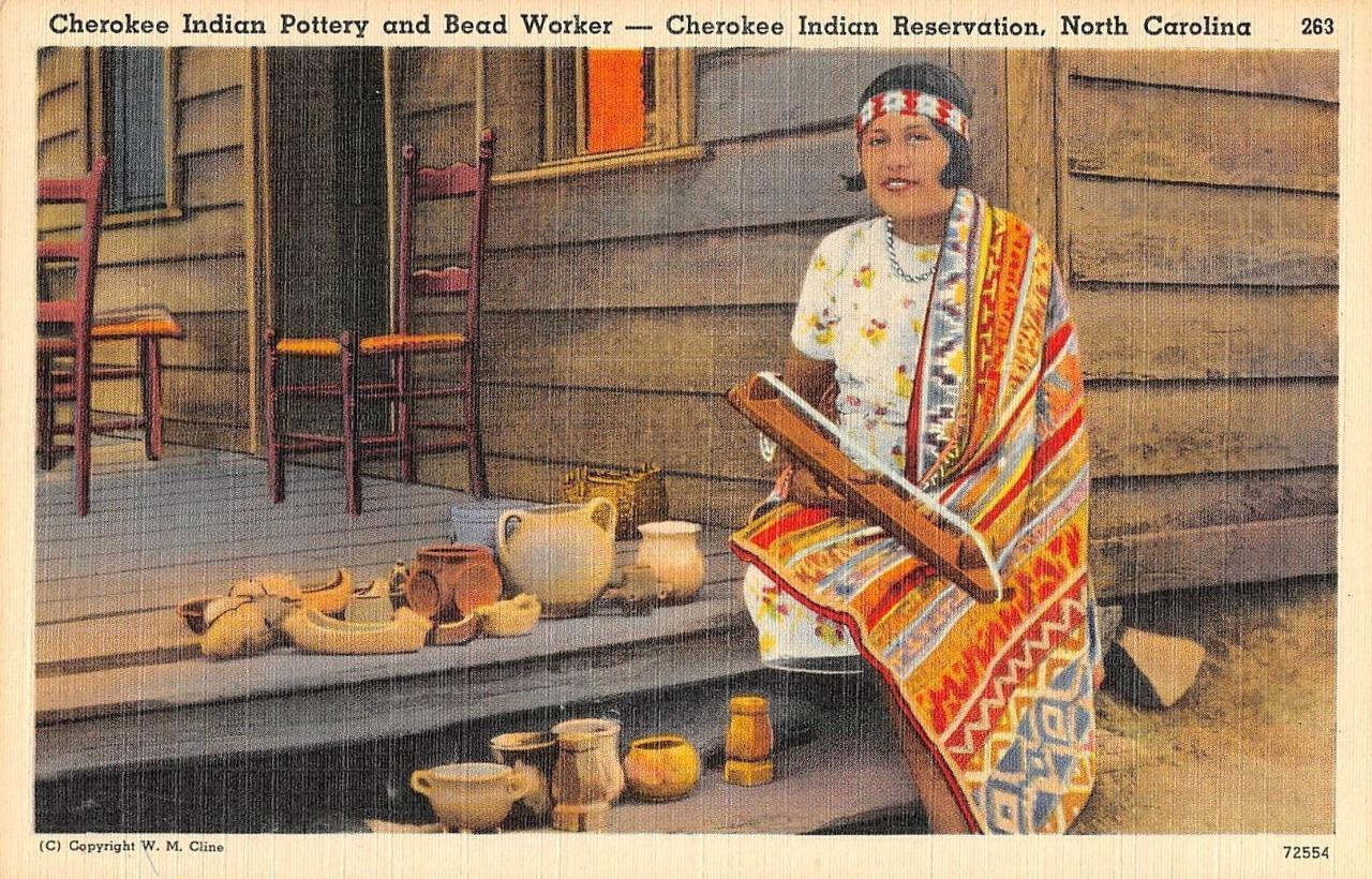 Cherokee Indian Reservation, NC Pottery & Bead Worker c1930s Vintage Postcard