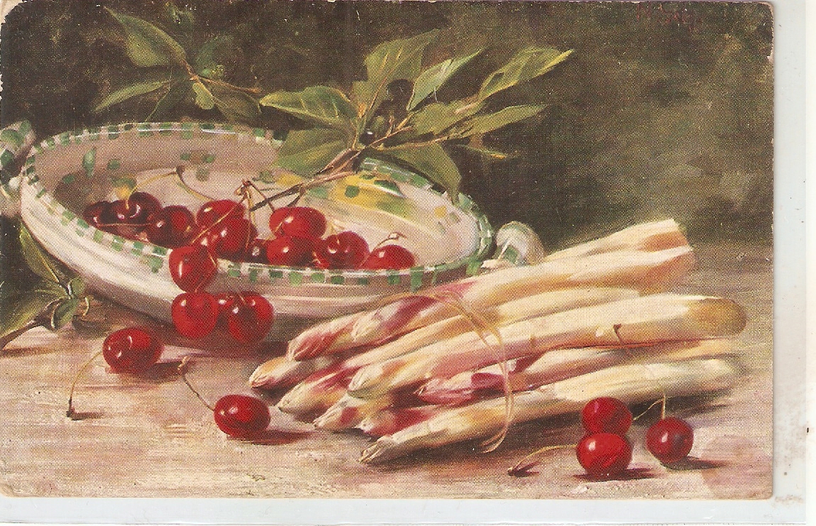 "Cherries and asaparagus" Nice old vintage German postcard
