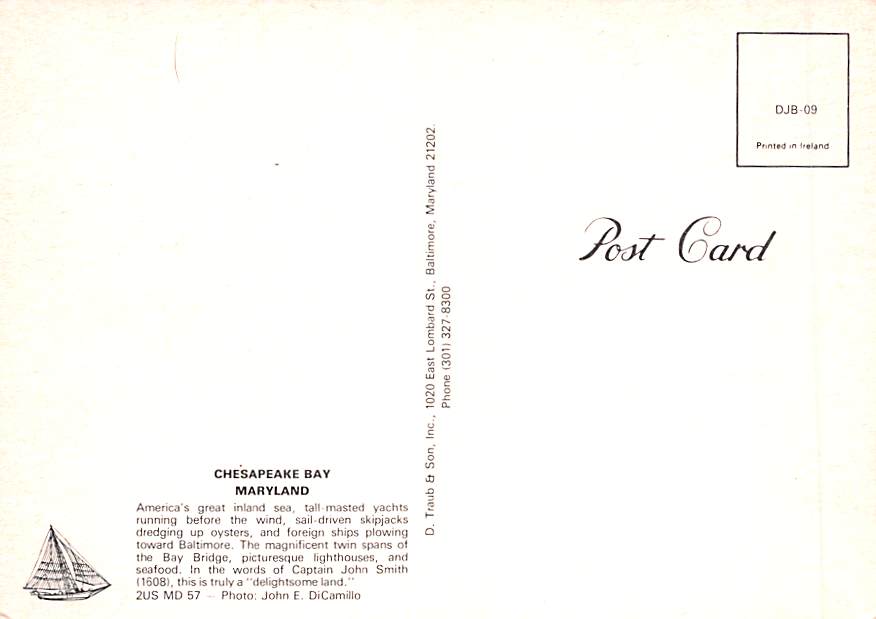 Chesapeake Bay - Maryland, USA Grade: 1 Category: Continental Size Postcard, Approx 4 in x 6 in (10 cm x 15.25 cm) Product Size: Continental size: 4X6 inches (10.5 cm x 15 cm) Grading Scale: Grade 1 = Perfect ... Read More