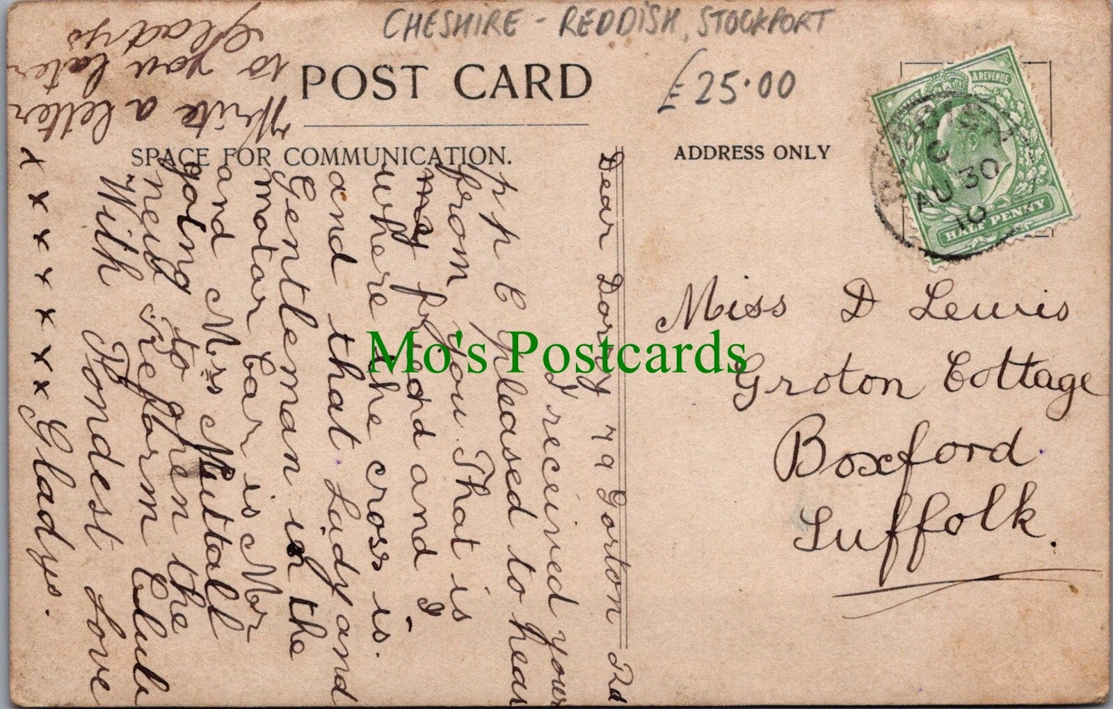 Reddish, Stockport, Cheshire. This is a fantastic standard sized postcard which would be a great addition to your postcard collection. Posted in 1910.This postcard has some creasing at top edge.If a postcard has any ... Read More