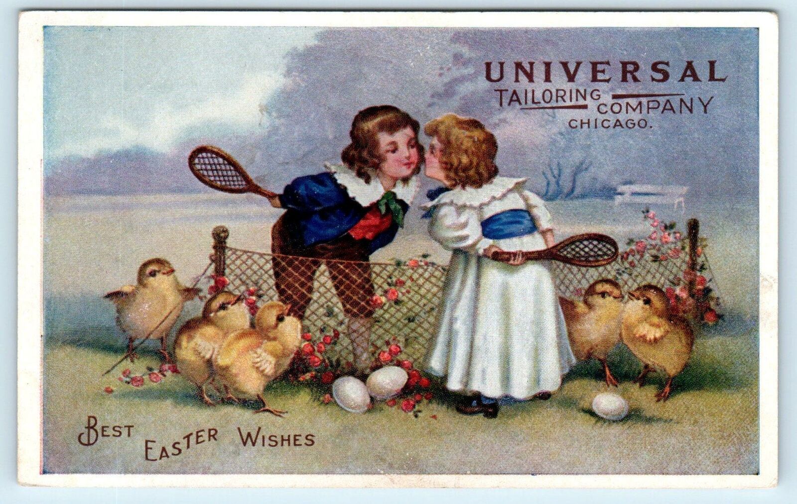 Great card- embossed Easter Greeting/Advertisement for Universal Tailoring Co- Boy & Girl about to kiss over badminton net as baby chicks watch.....Written ad on back.... Please Add me to your Favorite Sellers and feel free to email me with questions about item conditions as I try to describe them accurately. Please Visit My Hip Store, new items are added every week. All of our postcards are vintage antique postcards - we don't sell copies or reproductions (unless Repro is in title). FREE SHIPPING within CHICAGO, IL Illinois EASTER Advertising c1910s UNIVERSAL TAILORING COMPANY CHICAGO, IL Illinois EASTER Advertising c1910s UNIVERSAL TAILORING COMPANY Click image to enlarge Description Great card- embossed Easter Greeting/Advertisement for Universal Tailoring Co- Boy & Girl about to kiss over badminton net as baby chicks watch.....Written ad on back.... Please Add me to your Favorite Sellers and feel free to email me with questions about item conditions as I try to describe them accurately. Please Visit My Hip Store, new items are added every week. All of our postcards are vintage antique postcards - we don't sell copies or reproductions (unless Repro is in title). FREE SHIPPING within the U.S. - International Buyers pay $2.00 shipping. Get images thatmake Supersized seem small.Showcase your items with Auctiva'sListing Templates!THE simple solution for Hip sellers.Track Page Views WithAuctiva's FREE Counter