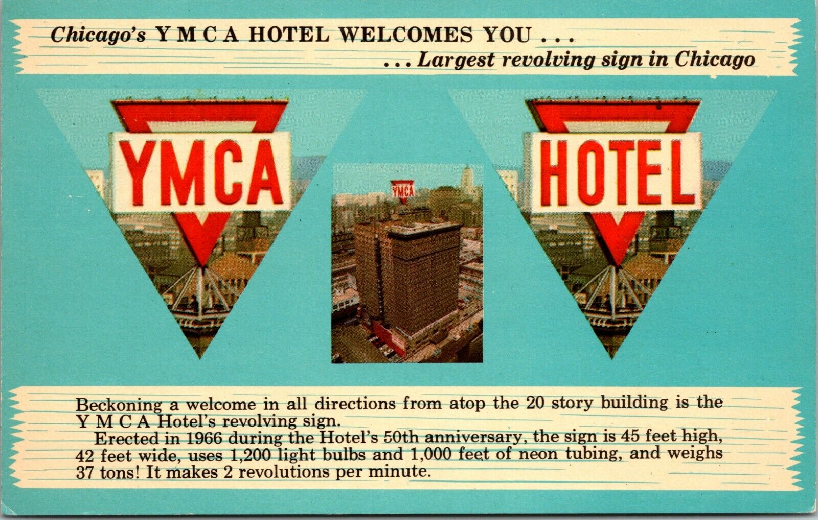 CHICAGO IL YMCA HOTEL LARGEST REVOLVING SIGN IN CHICAGO ~ MULTI-VIEW POSTCARD