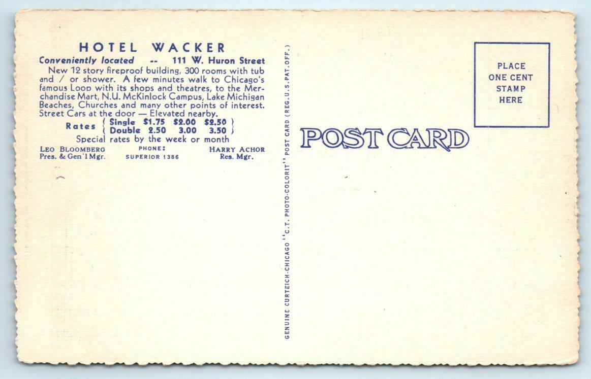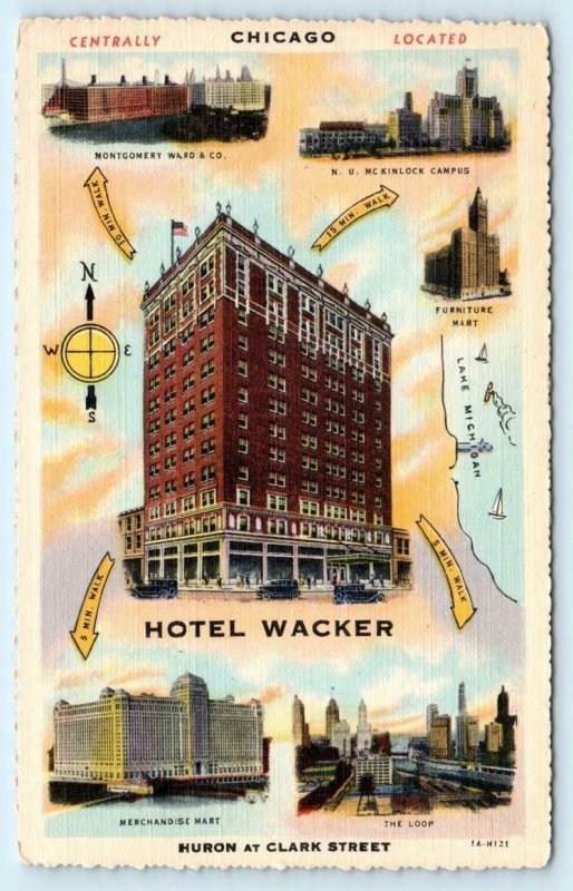 CHICAGO, Illinois IL ~ Roadside HOTEL WACKER & Landmarks 1930s Linen Postcard