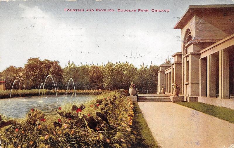 Chicago Illinois~Douglas Park~Fountain & Pavilion~Flower Beds~1913 Postcard
