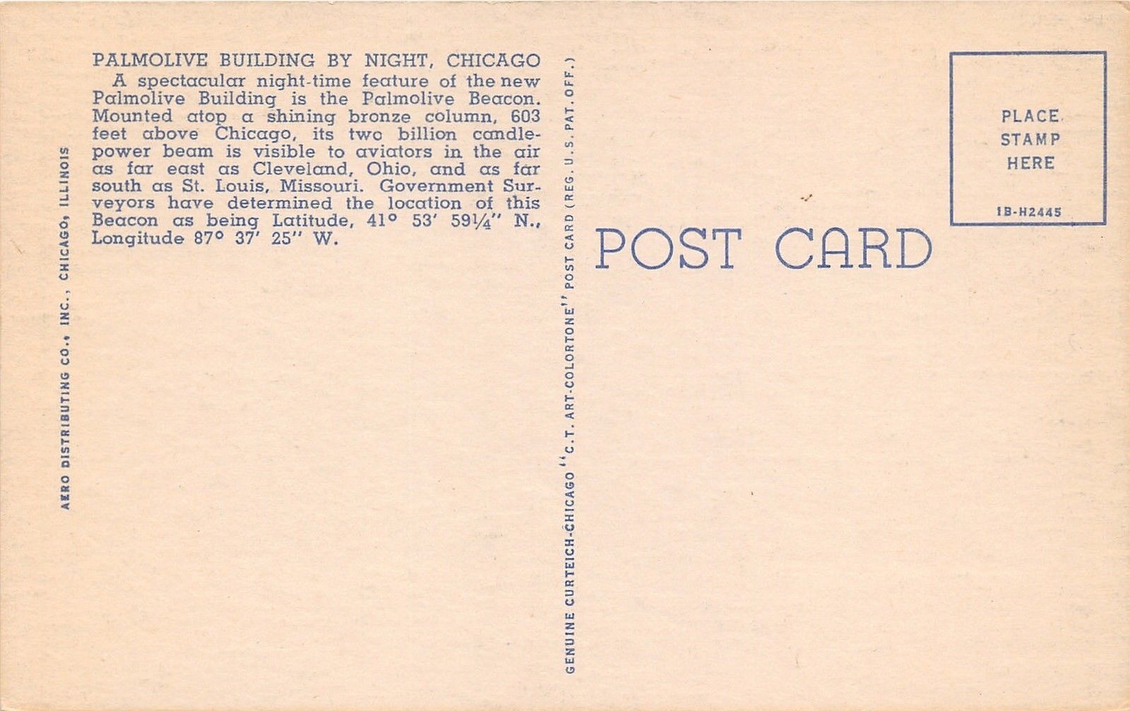 Chicago Illinois~Palmolive Building @ Night~1941 Aero Distributing Co Postcard
