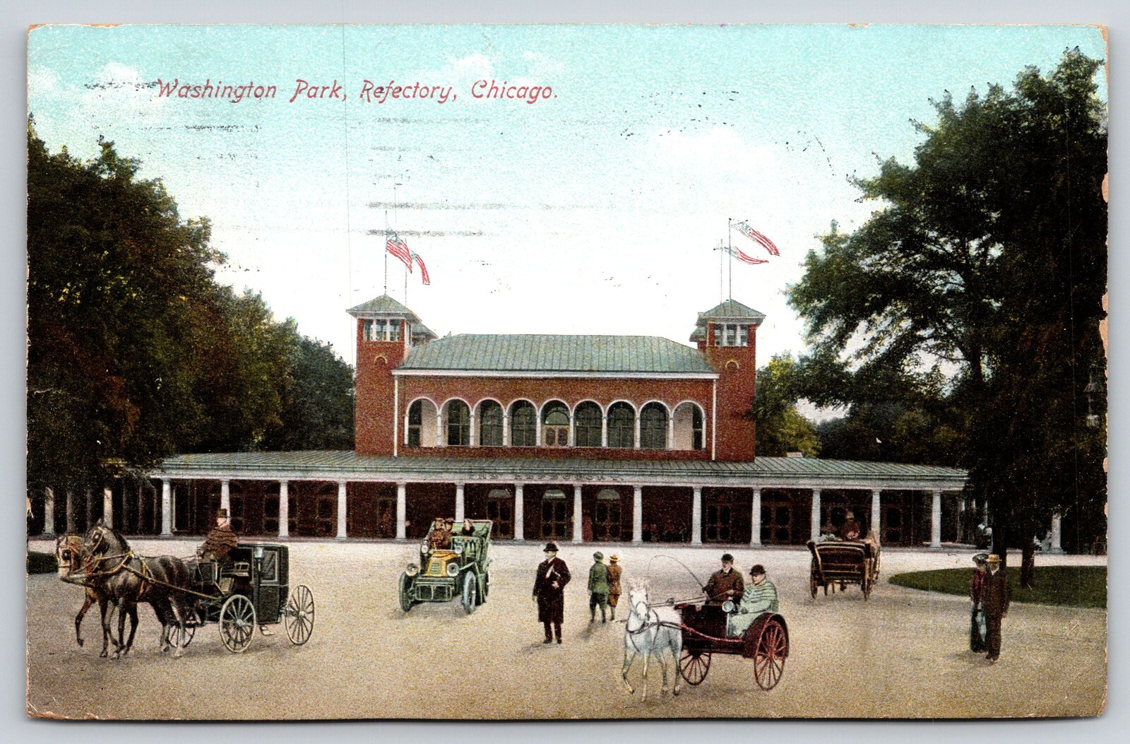 Chicago IL~Washington Park~Refectory Bldg~Carriage~Automobile~Flags~1909 PC