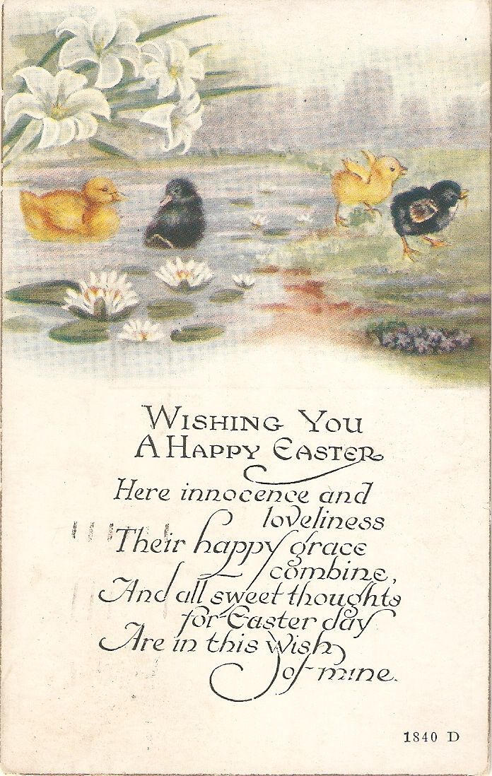 "chicks in pond. Flower" old vintage american easter greetings postcvard .Publisher: :OWEN CARD CO. PUB. CO. ELMIRA N.Y.