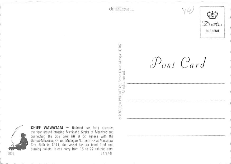 Chief Wawatam - Michigan Grade: 1 Category: Continental Size Postcard, Approx 4 in x 6 in (10 cm x 15.25 cm) Product Size: Continental size: 4X6 inches (10.5 cm x 15 cm) Grading Scale: Grade 1 = Perfect corner ... Read More