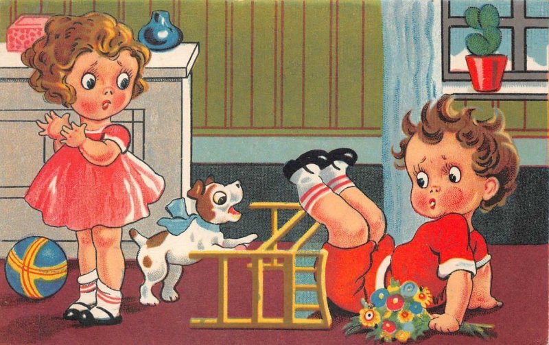 CHILDREN COMIC ROMANCE FLOWERS DOG NETHERLANDS POSTCARD 1913