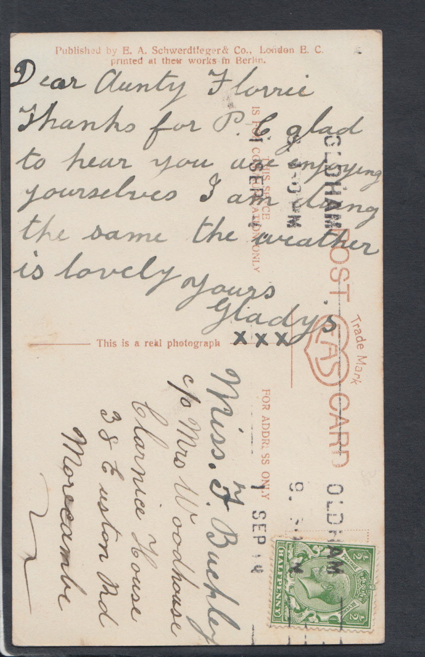 Genealogy information: miss f.Buckley, c/o mrs woodhouse, clarnice house, 38 euston road, morecambe