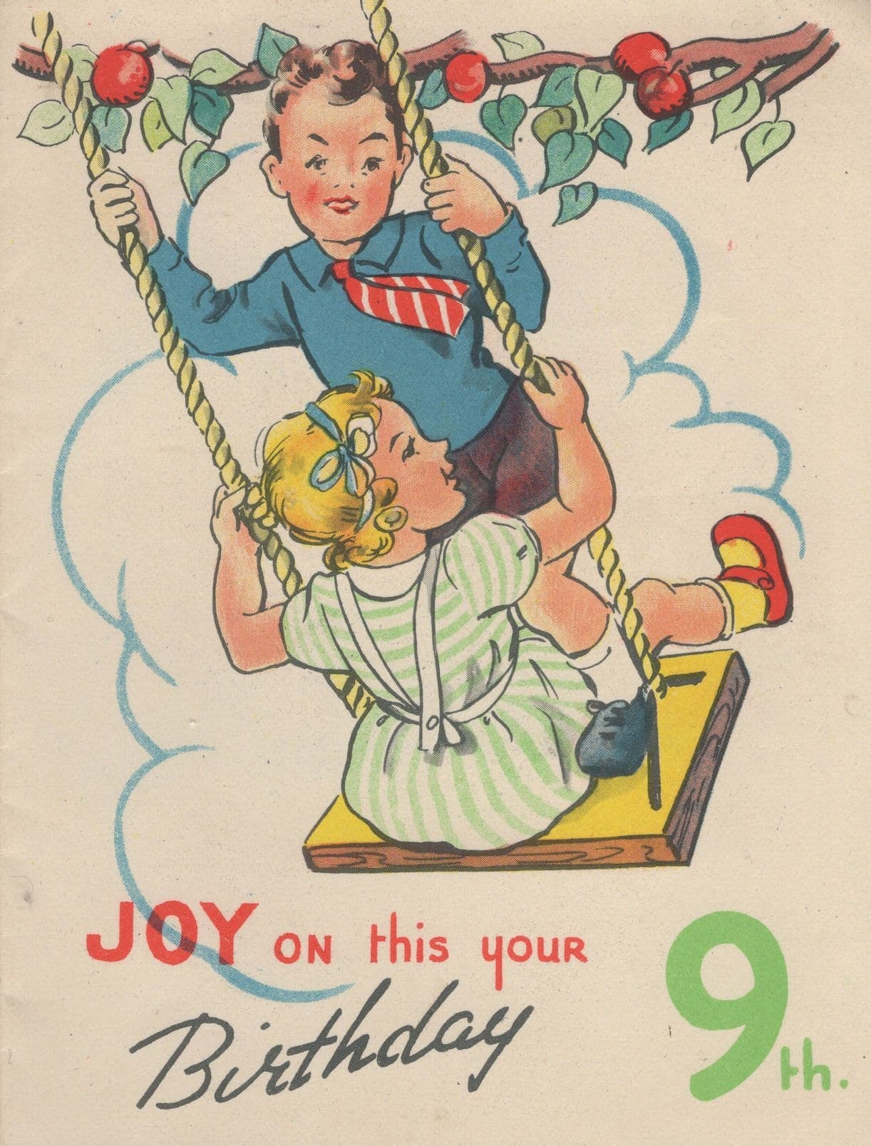 zx200 Antique fold open greetings card circa 1910 of this child on a swing - with message inside and mild places to allow graded vg and real character early 1900s card.