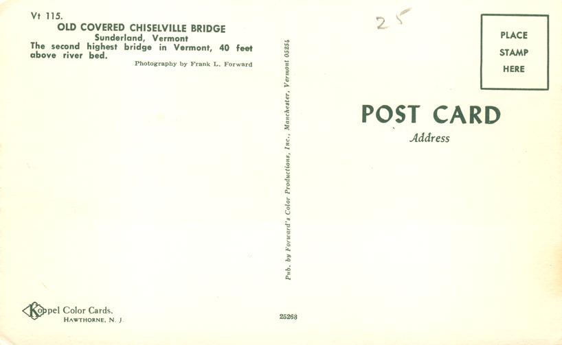 Chiselville Covered Bridge. Sunderland, Vermont. Standard sized chrome card. Very good condition.