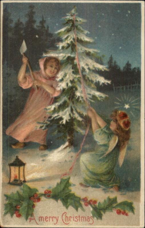 Christmas - Alngel Girls Chop Down tree c1910 Postcard