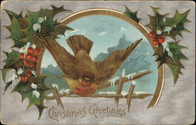 Christmas Bird Holly Berries Gilt Embossed Greeting c1910...