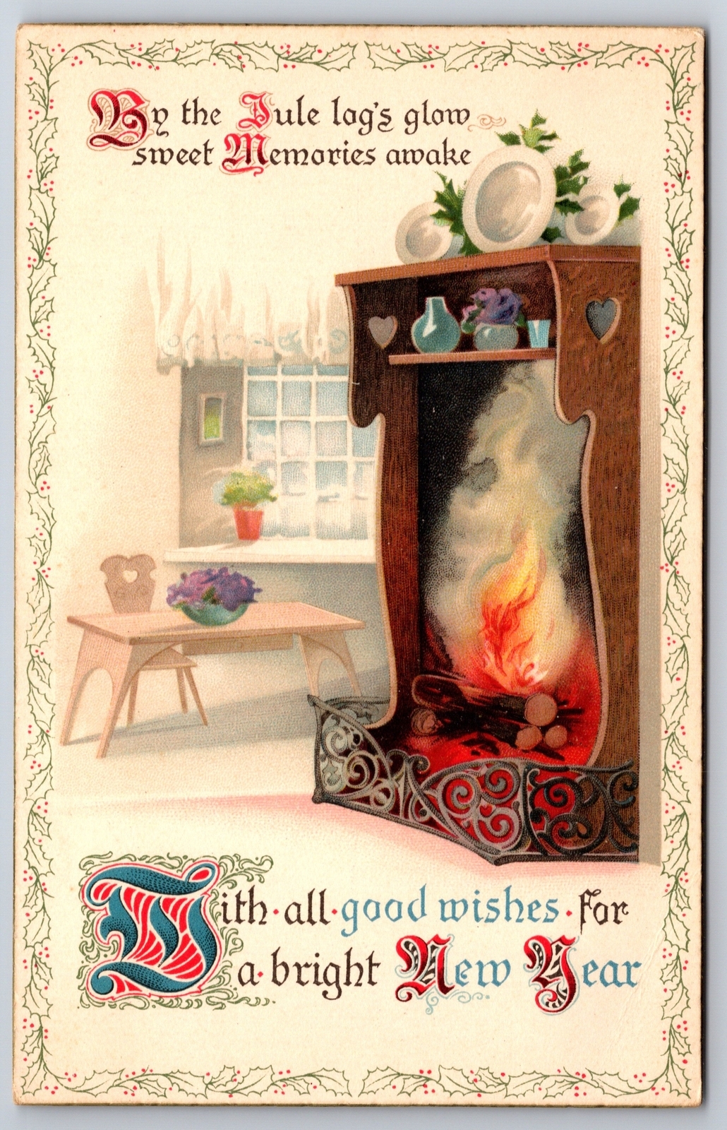 Christmas Calligraphy~Yule Log Glows In Fireplace Cupboard~PS Dresden c1907