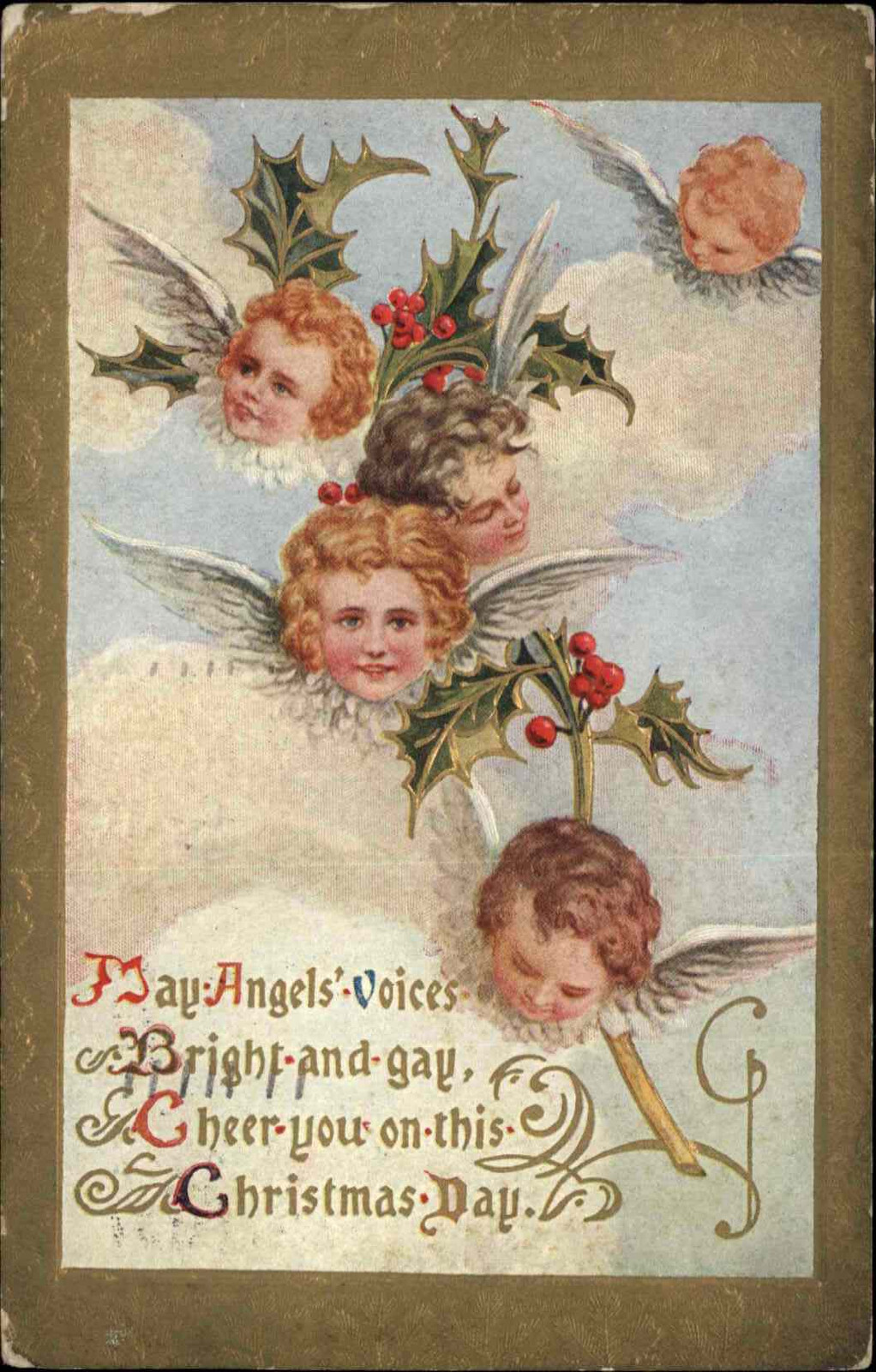 Christmas Cherubs Holly Gilt Embossed c1900s-20s Postcard