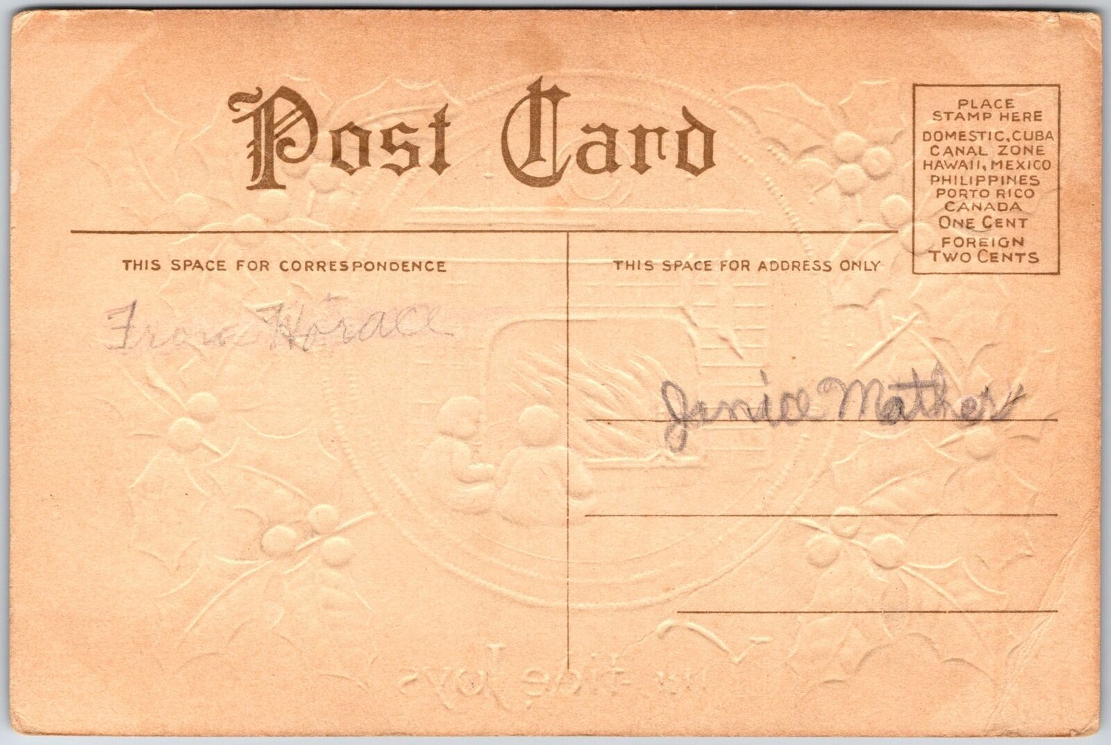 Christmas Children Fireplace Stocking Holly Leaf Cherry Old Postcard
