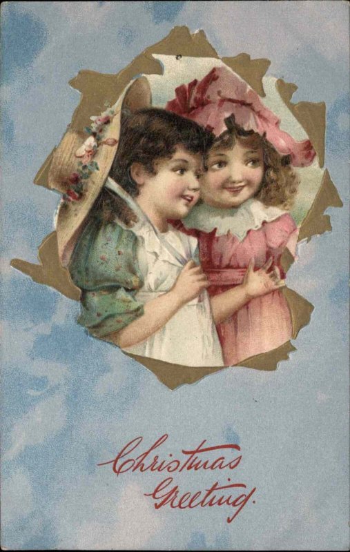 Christmas Children Girls with Fancy Hats Embossed c1910s Postcard