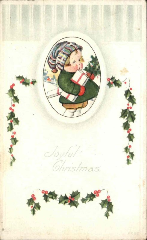 Christmas Children Holly Gift Embossed c1900s-20s Postcard