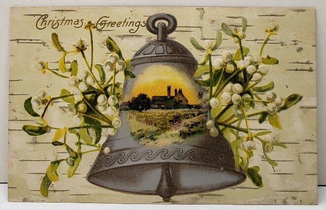 Christmas Country Scene on Silver Bell Birch Background Embossed Postcard E11