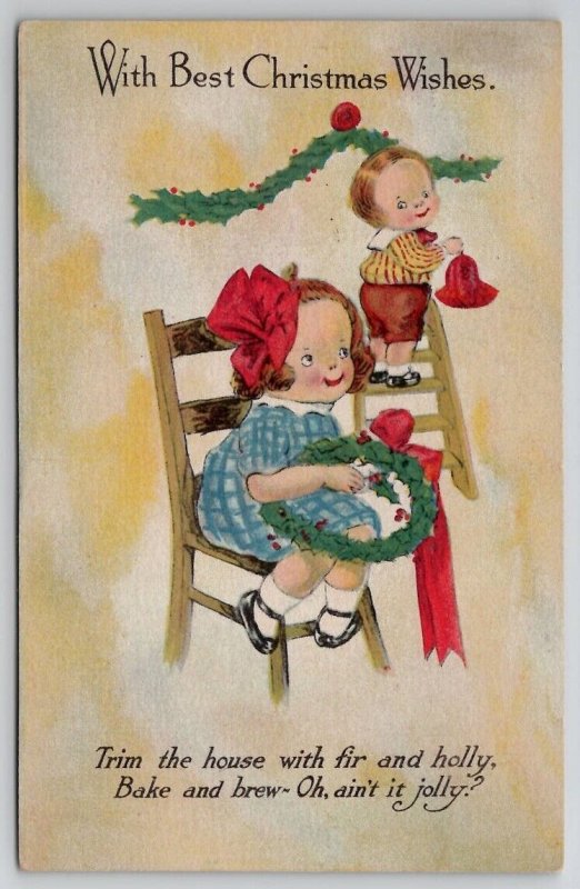 Christmas Greetings Children Decorating Wreath Bell Postcard U26