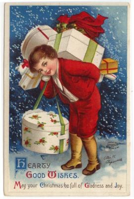 Christmas Greetings PC, Boy with gifts, Clapsaddle 1910