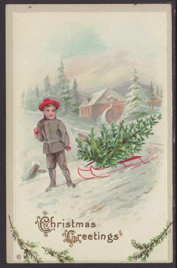 Christmas Greetings,Boy Pulling Sled with Tree Postcard