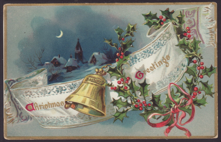 Christmas Greetings,Holly,Bell,Scene Postcard