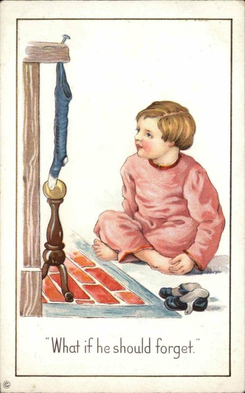 Christmas - Little Boy Sits Waiting at Fireplace Stecher c1915 Postcard