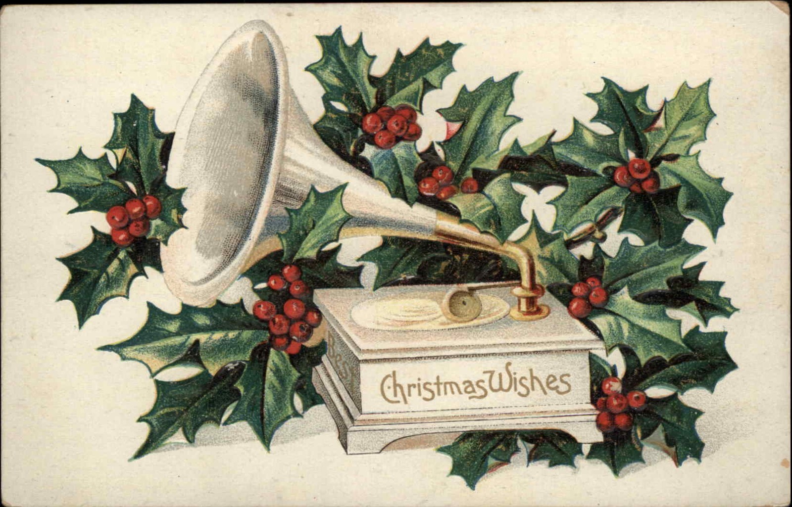 Christmas Phonograph & Holly Embossed c1910 Vintage Postcard